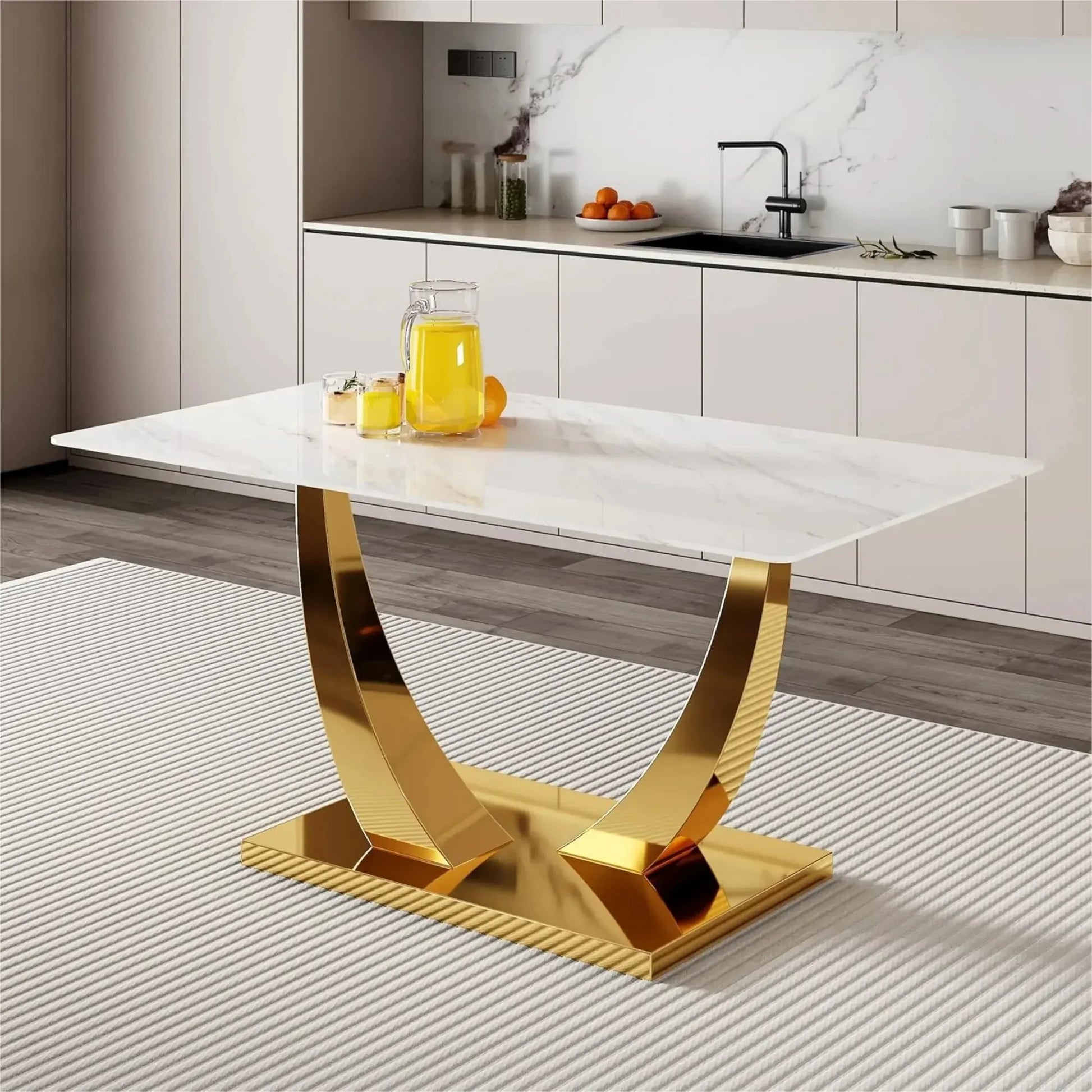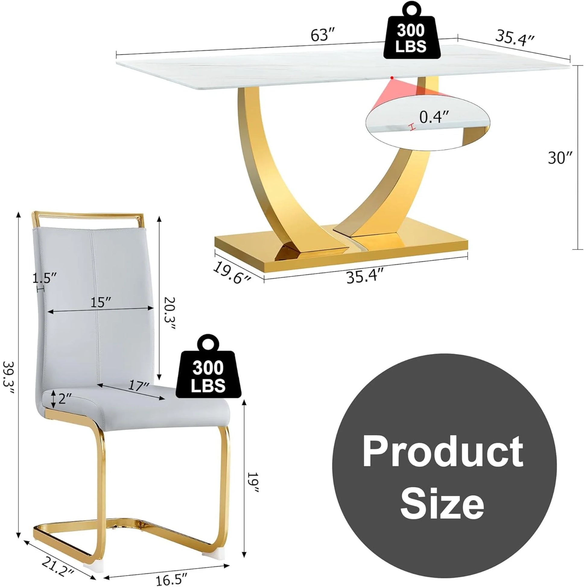 [Stylish Gold Dining Table Set for 4]:Upgrade your dining experience with our chic 5PCS glass dining room table set for 4, featuring a sleek 63'' rectangular tempered glass top. Perfect for hosting family dinners or casual gatherings, this set combines modern aesthetics with functional design.[Premium Tempered Glass Table]:The table boasts a robust 0.4'' thick tempered glass top. The surface is covered with a marbled decal. The elegant gold stainless steel U-shaped legs provide exceptional support, enhancing stability while adding a touch of sophistication to your dining area.